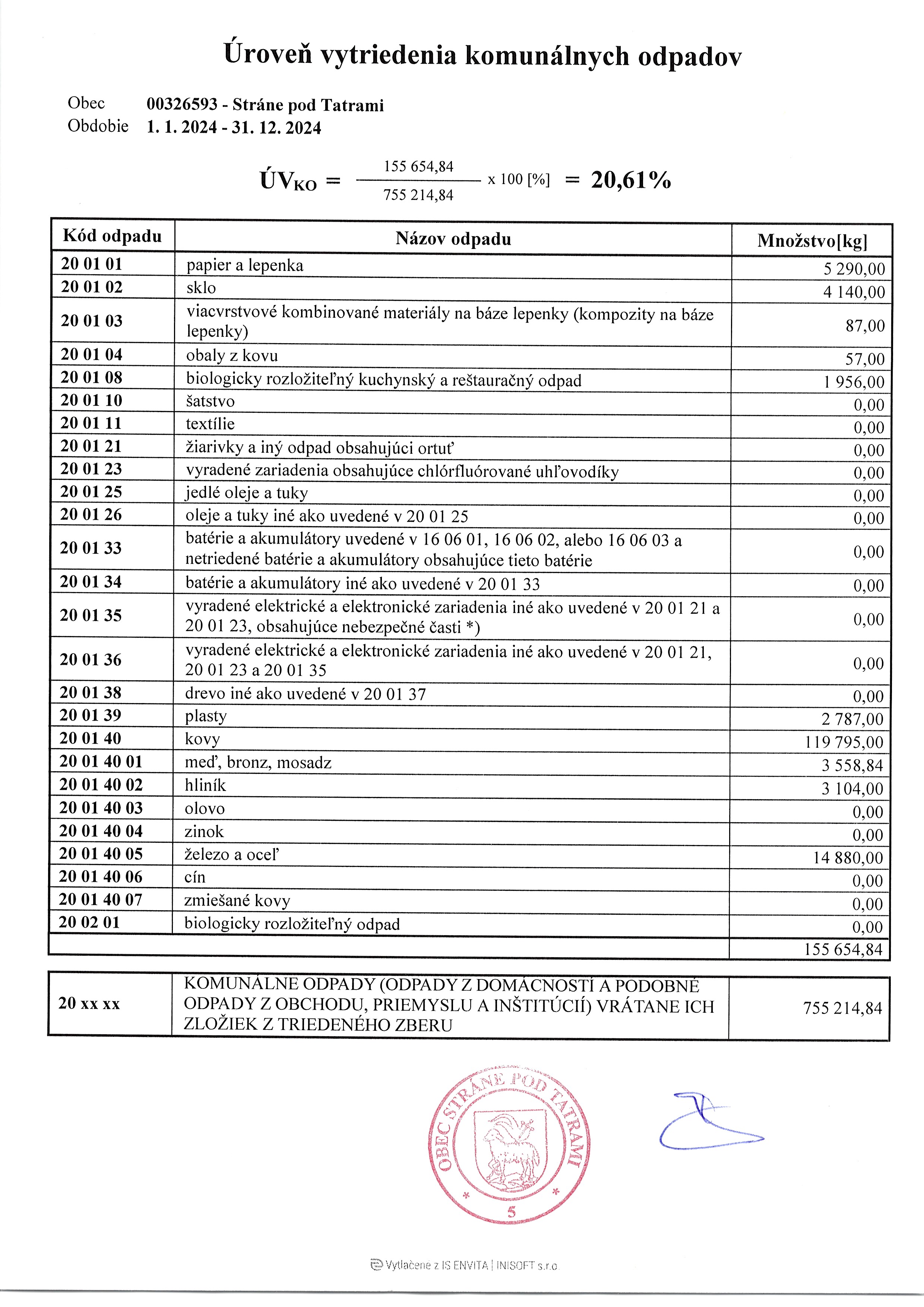 Úroveň vytriedenia komunálnych odpadov za rok 2024